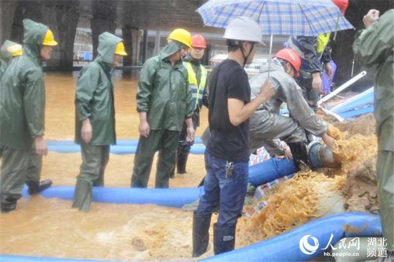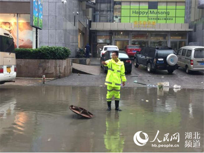 人民網(wǎng)武漢7月7日電 連日的暴雨使得武漢城區(qū)嚴重內(nèi)澇,漢陽區(qū)水務局排水隊疏撈班班長楊明峰是負責漢莎社區(qū)的80后帥氣小伙,為防止行人、車輛掉進去,他和隊員們圍在窨井旁,冒著暴雨,當起了“人肉標識”,站在積水最深處指揮交通,顯示水深的程度,避免車輛沖入水坑,并在緊急情況下伸出援手。6…