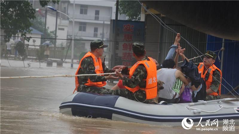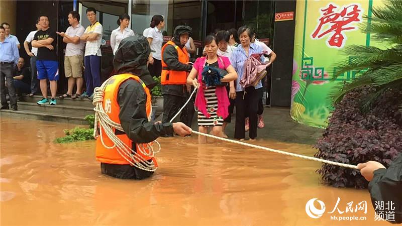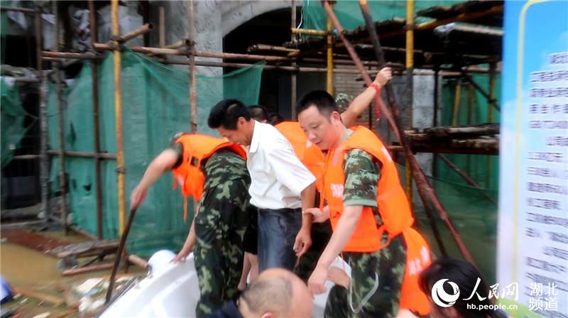 人民網(wǎng)陽新7月4日電 7月1日晚至4日,由于連日強降雨,湖北省多地出現(xiàn)大到暴雨,局部伴有雷暴大風(fēng)等強對流天氣。4日,暴雨導(dǎo)致位于湖北東南部陽新縣積水嚴重,發(fā)生內(nèi)澇,造成多人被困。當(dāng)?shù)叵拦俦劸鰟,成功營救28名被困群眾,協(xié)助政府緊急疏散百余名群眾。 4日上午8時36分,消…