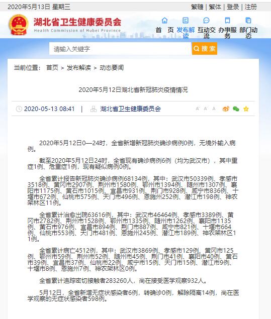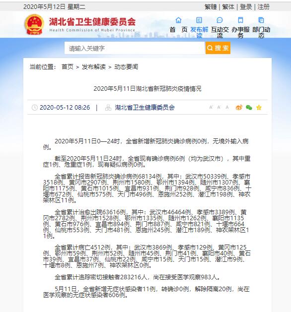 人民網(wǎng)武漢5月12日電 據(jù)湖北省衛(wèi)健委消息,2020年5月11日0—24時,湖北新增新冠肺炎確診病例0例,無境外輸入病例。 截至2020年5月11日24時,全省現(xiàn)有確診病例6例(均為武漢市),其中重癥1例、危重癥1例,現(xiàn)有疑似病例0例。 全省累計(jì)報(bào)告新冠肺炎確診病例68134例,其中:武漢市…[詳細(xì)]