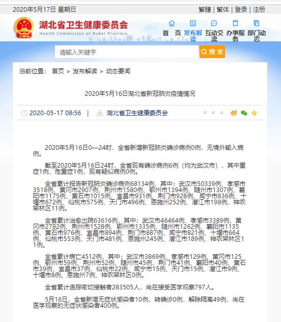 人民網(wǎng)武漢5月17日電 據(jù)湖北省衛(wèi)健委消息,2020年5月16日0—24時,湖北省新增新冠肺炎確診病例0例,無境外輸入病例。 截至2020年5月16日24時,全省現(xiàn)有確診病例6例(均為武漢市),其中重癥1例、危重癥1例,現(xiàn)有疑似病例0例。 全省累計(jì)報(bào)告新冠肺炎確診病例68134例,其中:武漢…[詳細(xì)]
