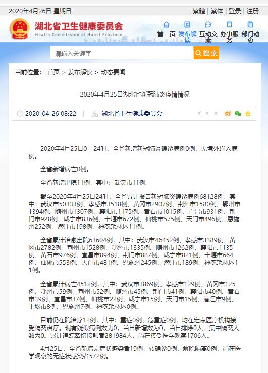 人民網(wǎng)武漢4月26日電 據(jù)湖北省衛(wèi)健委消息,2020年4月25日0—24時(shí),全省新增新冠肺炎確診病例0例,無境外輸入病例。 全省新增病亡0例。 全省新增出院11例,其中:武漢市11例。 截至2020年4月25日24時(shí),全省累計(jì)報(bào)告新冠肺炎確診病例68128例,其中:武漢市50333例、孝…[詳細(xì)]