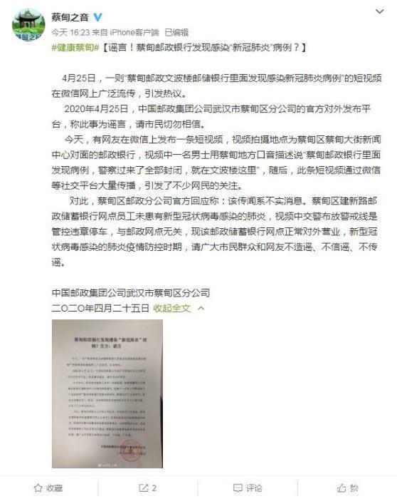 人民網(wǎng)武漢4月26日電 據(jù)武漢市蔡甸區(qū)人民政府官方微博消息,4月25日,一則“蔡甸郵政文波樓郵儲(chǔ)銀行里面發(fā)現(xiàn)感染新冠肺炎病例”的短視頻在微信、網(wǎng)上廣泛流傳,引發(fā)熱議。中國(guó)郵政集團(tuán)公司武漢市蔡甸區(qū)分公司發(fā)布公告稱,此事為謠言,請(qǐng)市民切勿相信。 公告原文如下: 今天,有網(wǎng)友在微信上發(fā)布一條短視頻…[詳細(xì)]