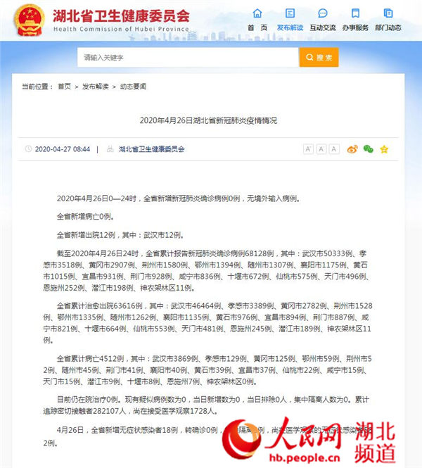 人民網(wǎng)武漢4月27日電 據(jù)湖北省衛(wèi)健委消息,2020年4月26日0—24時(shí),全省新增新冠肺炎確診病例0例,無境外輸入病例。 全省新增病亡0例。 全省新增出院12例,其中:武漢市12例。 截至2020年4月26日24時(shí),全省累計(jì)報(bào)告新冠肺炎確診病例68128例,其中:武漢市50333例、孝…[詳細(xì)]