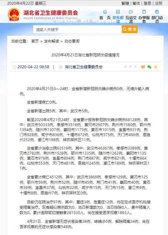 人民網(wǎng)武漢4月22日電 據(jù)湖北省衛(wèi)健委消息,2020年4月21日0—24時(shí),全省新增新冠肺炎確診病例0例,無境外輸入病例。 全省新增病亡0例。 全省新增出院5例,其中:武漢市5例。 截至2020年4月21日24時(shí),全省累計(jì)報(bào)告新冠肺炎確診病例68128例,其中:武漢市50333例、孝感市…[詳細(xì)]