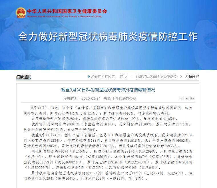 人民網(wǎng)武漢3月31日電 據(jù)國家衛(wèi)健委消息,3月30日0—24時,31個省(自治區(qū)、直轄市)和新疆生產(chǎn)建設(shè)兵團(tuán)報告新增確診病例48例,均為境外輸入病例;新增死亡病例1例(湖北1例);新增疑似病例44例,均為境外輸入病例。 當(dāng)日新增治愈出院病例282例,解除醫(yī)學(xué)觀察的密切接觸者1199人,重癥病例減…[詳細(xì)]