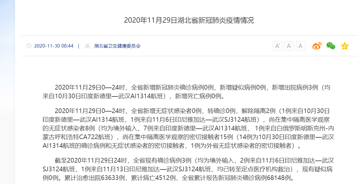 人民網(wǎng)武漢11月30日電 據(jù)湖北省衛(wèi)健委官網(wǎng)消息稱,2020年11月29日0—24時,全省新增新冠肺炎確診病例0例,新增疑似病例0例,新增出院病例3例(均來自10月30日印度新德里—武漢AI1314航班),新增死亡病例0例。 2020年11月29日0—24時,全省新增無癥狀感染者0例,轉(zhuǎn)確診0例…[詳細]