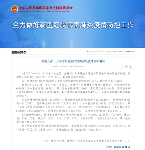 人民網(wǎng)武漢3月20日電 據(jù)國家衛(wèi)健委消息,3月19日0—24時,31個。ㄗ灾螀^(qū)、直轄市)和新疆生產(chǎn)建設(shè)兵團(tuán)報告新增確診病例39例,新增死亡病例3例(湖北2例,遼寧1例),新增疑似病例31例。 當(dāng)日新增治愈出院病例730例,解除醫(yī)學(xué)觀察的密切接觸者1197人,重癥病例減少178例。 截至3月…[詳細(xì)]