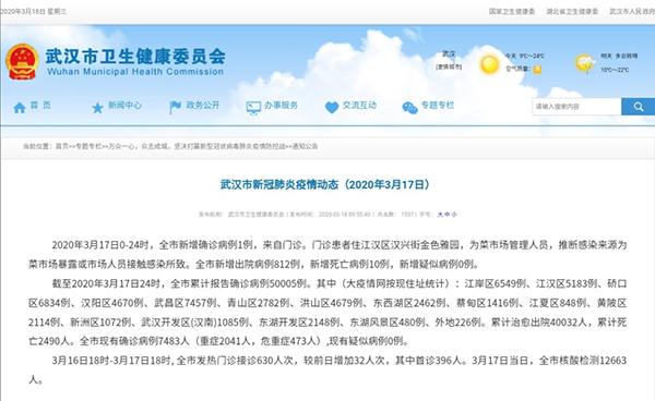 人民網武漢3月18日電 據武漢市衛(wèi)生健康委員會消息,2020年3月17日0-24時,武漢市新增確診病例1例,來自門診。門診患者住江漢區(qū)漢興街金色雅園,為菜市場管理人員,推斷感染來源為菜市場暴露或市場人員接觸感染所致。全市新增出院病例812例,新增死亡病例10例,新增疑似病例0例。 截至2020年…[詳細]