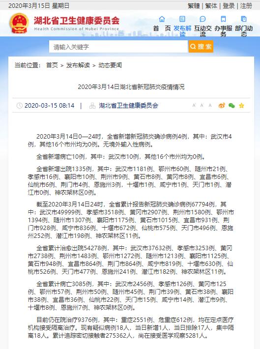 人民網(wǎng)武漢3月15日電 據(jù)湖北衛(wèi)健委消息,2020年3月14日0—24時(shí),全省新增新冠肺炎確診病例4例,其中:武漢市4例,其他16個(gè)市州均為0例。無境外輸入性病例。 全省新增病亡10例,其中:武漢市10例,其他16個(gè)市州均為0例。 全省新增出院1335例,其中:武漢市1181例、鄂州市60例…[詳細(xì)]