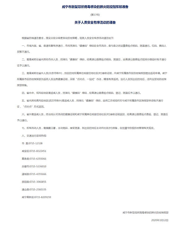 人民網(wǎng)咸寧3月12日電 3月12日,咸寧市新型冠狀病毒感染的肺炎防控指揮部,就人員安全有序流動發(fā)布通告,市民憑湖北“健康碼”綠碼在全市流動,縣與縣之間設(shè)置查驗點核碼、測溫通行。紅碼、黃碼人員暫不通行。 一、市域內(nèi)國、省、縣道恢復(fù)有序通行,市民憑湖北“健康碼”綠碼在全市流動,縣與縣之間設(shè)置查驗點核…[詳細]