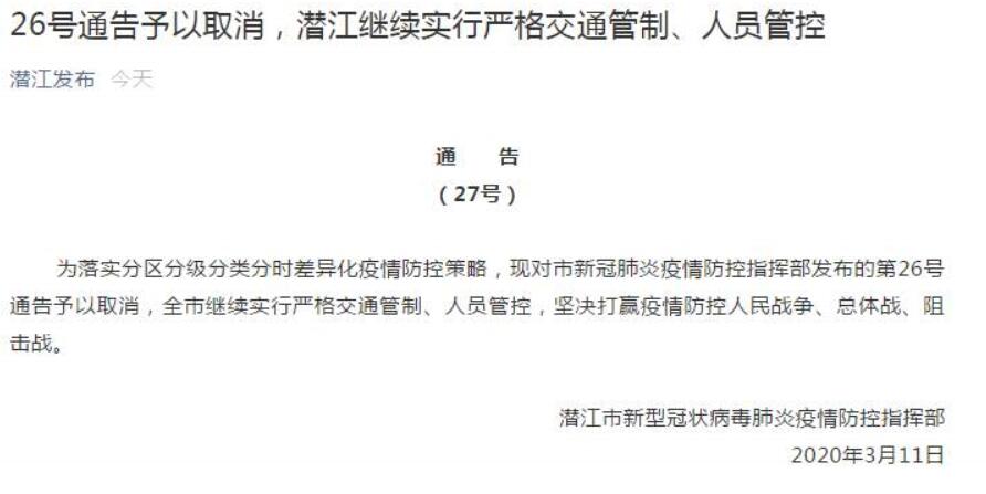 人民網(wǎng)潛江3月11日電 3月11日,湖北潛江發(fā)布第27號(hào)通告,取消此前發(fā)布的第26號(hào)通告,稱全市繼續(xù)實(shí)行嚴(yán)格交通管制、人員管控。 全文如下: 為落實(shí)分區(qū)分級(jí)分類分時(shí)差異化疫情防控策略,現(xiàn)對(duì)市新冠肺炎疫情防控指揮部發(fā)布的第26號(hào)通告予以取消,全市繼續(xù)實(shí)行嚴(yán)格交通管制、人員管控,堅(jiān)決打贏疫情防控…[詳細(xì)]