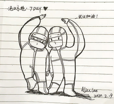 2月17日,入艙第五天。天放晴了,我原本郁悶的心情也好了很多,畫(huà)畫(huà)的本能也隨之激發(fā),開(kāi)始注意觀察周?chē)尼t(yī)護(hù)人員。每一天,我都把漫畫(huà)版“方艙日記”發(fā)到網(wǎng)上。這些給我溫暖的守護(hù)者就是我心中的英雄。有一位來(lái)自安徽的護(hù)士,她叫胡慧文?粗龓е∮烟瑁亲藙(shì)像在飛翔,太可愛(ài)了。今天早晨,兩位護(hù)士推著小車(chē)發(fā)放飯菜。好像是輪子不太靈活,也好像是穿著防護(hù)服不太方便,他們推得有點(diǎn)艱難。我把他們也畫(huà)了出來(lái)。