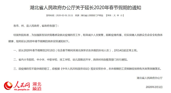 人民網(wǎng)武漢2月1日電 剛剛,湖北省人民政府辦公廳發(fā)布通知,經(jīng)國務院批準,為加強新型冠狀病毒感染肺炎疫情防控工作,延長2020年春節(jié)假期至2月13日(包含春節(jié)期間來湖北探親訪友休假的外地人員),2月14日起正常上班。省內(nèi)大專院校、中小學、中職學校、技工學校、幼兒園推遲開學,具體時間由教育部門另行通知![詳細]