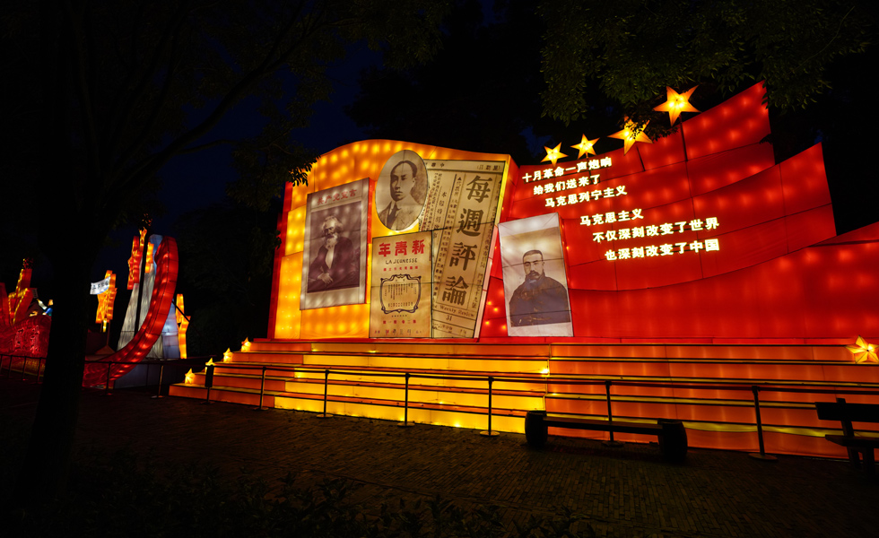 從《神州春雷——馬克思主義在中國(guó)傳播》到《新中國(guó)成立——開(kāi)國(guó)大典》,從《黨的十一屆三中全會(huì)》到《實(shí)現(xiàn)中華民族偉大復(fù)興的中國(guó)夢(mèng)》……彩燈閃耀、光影絢麗。
