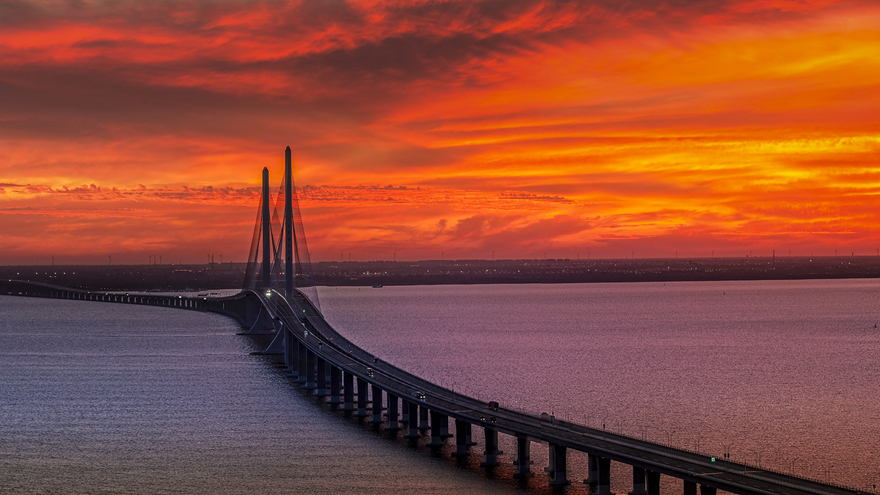 晨曦中,上海長江大橋如蛟龍騰空,在赤紅云潮中劃出鋼鐵弧線。車輛燈光似鱗片閃爍,江面倒映天際熔金,展現(xiàn)自然造化與大國工匠的交響。作為長三角一體化核心通道,日均12萬輛次車流在此匯聚鋼索如時代經(jīng)緯拉起發(fā)展脊梁,定格中國最活躍經(jīng)濟帶的晨曦律動,詮釋影動長江主題下自然與文明共生的壯美詩篇。