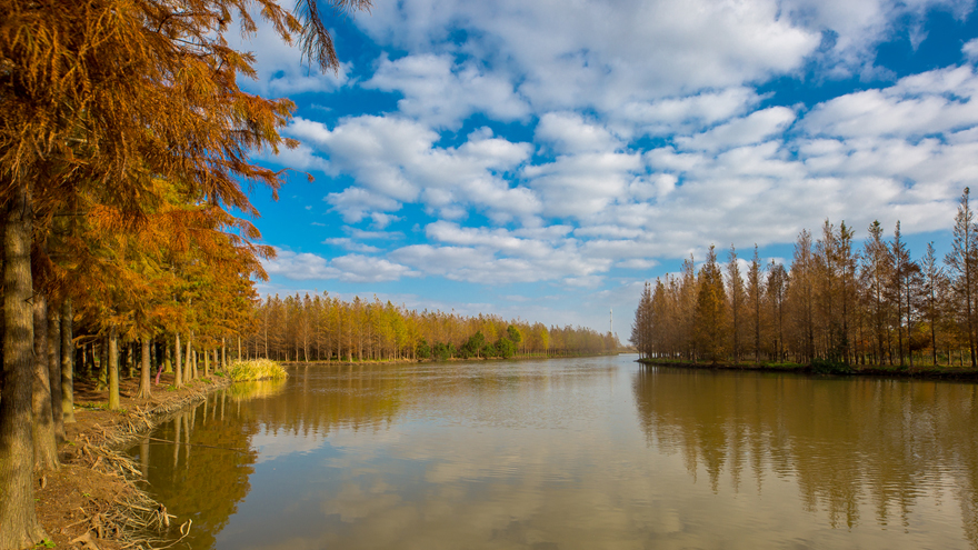 攝于上海市崇明區(qū)長江入口處,秋季水杉的色彩與水天交融的鏡像之美。