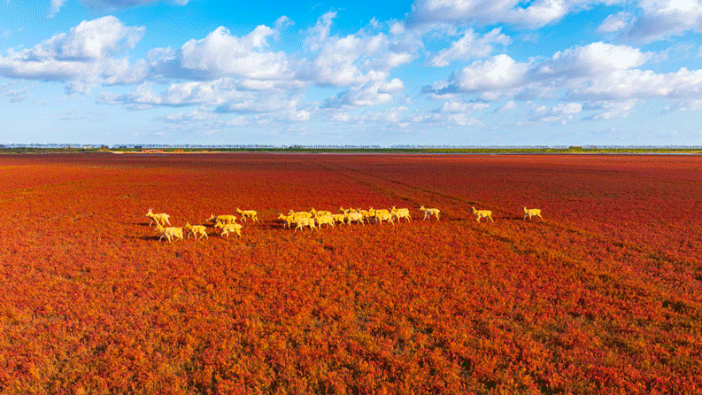 2024年11月4日,江蘇鹽城東臺(tái)條子泥濕地,萬(wàn)畝鹽蒿進(jìn)入最佳觀賞期,染紅的鹽蒿地猶如一塊巨大的紅地毯。國(guó)家一級(jí)保護(hù)動(dòng)物野生麋鹿在色彩斑斕的鹽蒿地棲息、嬉戲、奔跑,構(gòu)成一幅幅人與自然和諧共生的生態(tài)畫卷,美不勝收。