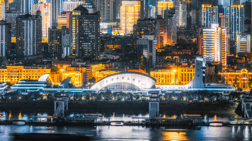 拍攝于湖北省武漢市武昌區(qū)。入夜后,漢口江灘的燈光秀亮起,鱗次櫛比的高樓大廈與璀璨耀眼的燈光給人一種置身于未來(lái)城市的感覺(jué)。