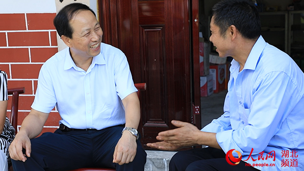 湖北省農(nóng)村信用社聯(lián)合社黨委書記、理事長李亞華與貧困戶親切交談