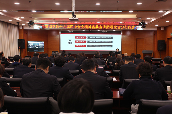 1月6日,學(xué)習(xí)貫徹黨的十九屆四中全會(huì)精神省委宣講團(tuán)走進(jìn)郵儲(chǔ)銀行湖北省分行,武漢大學(xué)二級(jí)教授、博士生導(dǎo)師、政黨研究所所長(zhǎng)丁俊萍教授作了十九屆四中全會(huì)精神主題宣講。郵儲(chǔ)銀行湖北省分行全省近400名黨員領(lǐng)導(dǎo)干部通過(guò)現(xiàn)場(chǎng)和視頻會(huì)議系統(tǒng)聆聽(tīng)了報(bào)告。