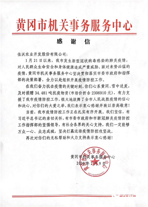 負(fù)責(zé)接收此批捐贈物資的黃岡市機(jī)關(guān)事務(wù)服務(wù)中心表示,佳沃股份心系黃岡、雪中送炭,及時捐贈抗疫物資,有力支援了黃岡疫情防控工作,極大鼓舞了黃岡人民戰(zhàn)勝疫情的信心和決心,對此表示衷心感謝。他們將把這批愛心物資送往防疫一線后勤食堂,為一線工作人員和患者提供餐飲保障。