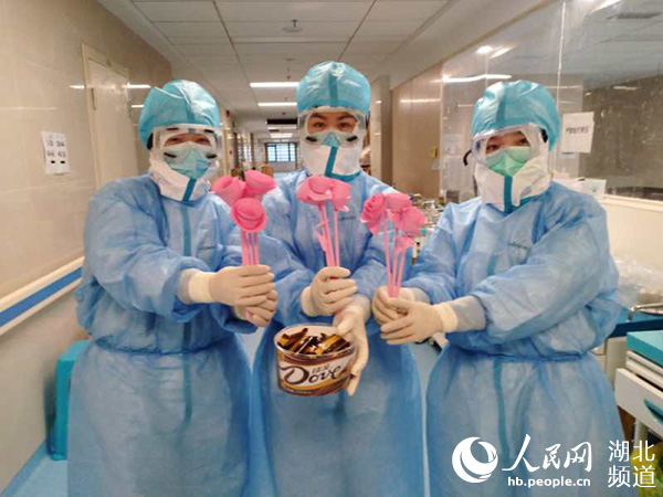 2月14日,一個特殊的日子,在黃岡大別山區(qū)域醫(yī)療中心南1棟西5病區(qū)里,來自湖南第二批醫(yī)療隊株洲市人民醫(yī)院的段陽老師和她的戰(zhàn)友們用半天的時間用粉色A4紙和訂書針制作了一批紙質(zhì)粉紅玫瑰,帶上全組人員省下來的巧克力,為該病區(qū)14名年輕的患者送上了節(jié)日的祝福。