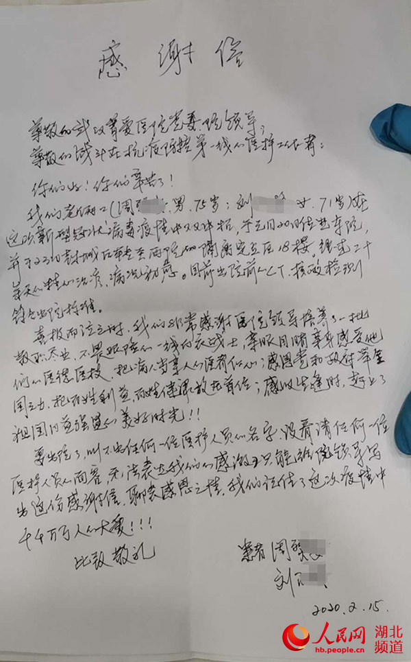 “要出院了,但叫不出任何一位醫(yī)護人員的名字,沒看清任何一位醫(yī)護人員的面容,無法表達(dá)我們的感激,只能寫出這封感謝信,聊表感恩之情,我們記住了這次疫情中千千萬萬份大愛! 2月16日一早正在病房參與查房的武漢市第四醫(yī)院感染病區(qū)18樓護士長歐陽斐收到了一封手寫的感謝信。寫信人是病區(qū)兩位即將出院的古稀老人。