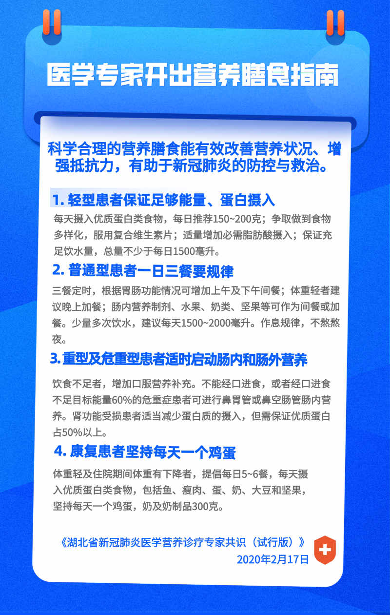 近日,《湖北省新型冠狀病毒肺炎醫(yī)學(xué)營(yíng)養(yǎng)診療專家共識(shí)(試行版)》正式發(fā)布。該方案由華中科技大學(xué)同濟(jì)醫(yī)院牽頭,湖北省醫(yī)院協(xié)會(huì)臨床營(yíng)養(yǎng)管理專業(yè)委員會(huì)、湖北省臨床營(yíng)養(yǎng)質(zhì)控中心和湖北省營(yíng)養(yǎng)學(xué)會(huì)臨床營(yíng)養(yǎng)分會(huì)制訂,供定點(diǎn)收治醫(yī)院和方艙醫(yī)院參考應(yīng)用。