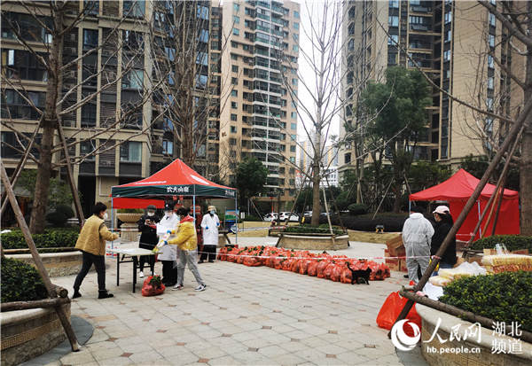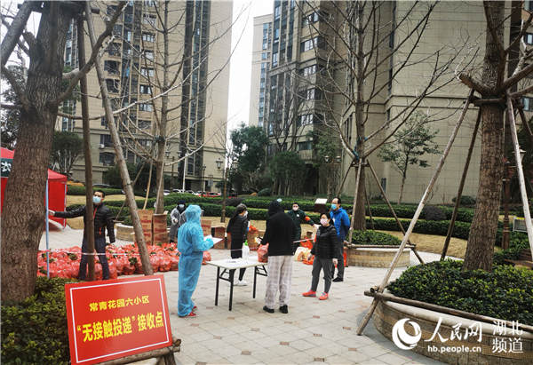 人民網(wǎng)武漢2月19日電 2月19日中午,武漢市常青花園六小區(qū)的“無(wú)接觸投遞”接收點(diǎn),一袋袋獨(dú)立分裝好的蔬菜已配送到達(dá),集中放置在用隔離線圍起來(lái)的一片空地上。前來(lái)領(lǐng)取團(tuán)購(gòu)物資的居民,在工作人員指引下做好登記后有序領(lǐng)取。