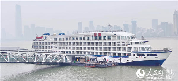 2月20日6時12分,“藍(lán)鯨”游輪從宜昌桃花村碼頭啟航,21日中午抵達(dá)武漢王家巷!八{(lán)鯨”游輪2010年全新裝修,整個游輪按照五星級豪華游輪標(biāo)準(zhǔn)。為了給逆行的醫(yī)務(wù)者服好務(wù),船舶行駛過程中,在船人員繼續(xù)爭分奪秒做好準(zhǔn)備工作。