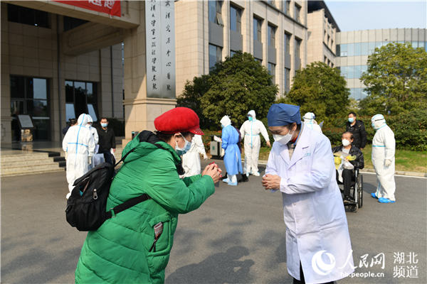 69歲的梅婆婆按捺不住出院的喜悅,連聲向歡送他們的東院區(qū)以及新疆醫(yī)療隊(duì)醫(yī)護(hù)人員致謝!皠傔M(jìn)醫(yī)院時(shí),我都以為自己扛不過(guò)去了。多虧你們精心治療,我才能走出醫(yī)院的大門。”聽(tīng)說(shuō)李蘭娟院士也來(lái)歡送他們出院,梅婆婆很是激動(dòng),熱淚盈眶地向著李蘭娟院士鞠躬致謝,“感謝你們幫助武漢人!”她還不忘叮囑比她年長(zhǎng)4歲的李蘭娟院士,在治療病人的同時(shí)一定要多保重,多注意身體。李蘭娟院士也禮貌地向她鞠躬還禮。