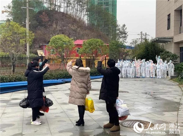 英山縣治愈患者與醫(yī)生告別。(吳滕鈺 攝)