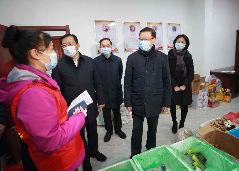 在江岸區(qū)球場街同慶閣社區(qū),應勇蹲下身仔細察看菜品質量、商品價格,叮囑社區(qū)一定要照顧好孤寡老人等特殊群體的生活。
