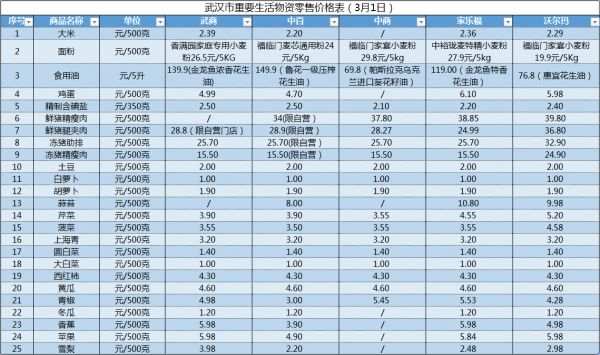 周日(3月1日),武漢發(fā)布武商、中百、中商、家樂福、沃爾瑪?shù)任宕蟪?5種重要生活物資銷售價格,雞蛋每斤最低4.7元/斤,最高價格為6.1元/斤;鮮豬精瘦肉最便宜每斤價格34元,最高價格每斤39.8元;黃瓜五大商超價格均為4.6元/斤;蘋果每斤最便宜為4.9元,最貴為5.98元。詳見下圖: