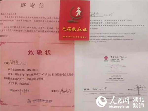 吳寧寧展示感謝信、致敬狀和獻(xiàn)血證(吳寧寧攝)