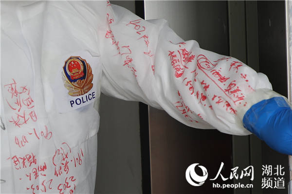 穿著這件“絕版防護(hù)服”的,正是湖北荊州市公安局沙市區(qū)分局勝利街派出所所長(zhǎng)代睿!白o(hù)目鏡起霧視線模糊,又怕漏掉居民的需求,只好寫在防護(hù)服上。我的手臂上寫的都是急需的藥品等物資,胸前和腿上寫的是急需的生活用品!贝Uf(shuō),這樣記錄方便也能看的清。