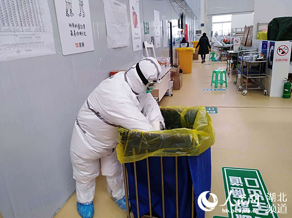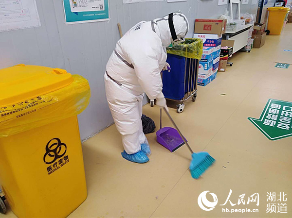 環(huán)衛(wèi)突擊隊(duì)員張漢喬在沌口方艙醫(yī)院做保潔。受訪者供圖