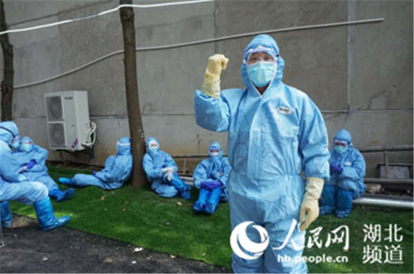 穿過通道來到艙外,直射的陽(yáng)光讓人既感到溫暖。樹蔭下,一群穿著藍(lán)色防護(hù)衣的工作人員席地而坐在休息,不少隊(duì)員已經(jīng)累得靠在樹干打盹,他們是來自西安國(guó)際醫(yī)學(xué)中心醫(yī)院支援湖北醫(yī)療隊(duì)后勤保障組工作人員,每天從早上7點(diǎn)開始工作到下午6點(diǎn)左右,現(xiàn)在剛剛忙完上一輪的物資調(diào)配任務(wù),出來稍作休整。組長(zhǎng)張國(guó)亮對(duì)著鏡頭舉起拳頭大聲喊著:“武漢加油!”