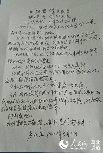 剛進到驛站的當天,方友發(fā)就完全適應(yīng)了這里的環(huán)境,驛站里的條件超出了他的預判,空間很大,康復人員的鋪位距離也很寬,生活配套設(shè)備完善,伙食標準高,最重要的是,想到每天都能見到妻子,心里覺得特別踏實,并且經(jīng)過了這場疫情后,兒子也仿佛一夜間成熟了許多,變得很堅強。方友發(fā)在總結(jié)自己的治療過程時稱,“家庭和睦帶來的強大精神支柱是最好的良方,加上國家最大力度給予的幫助,這場全人類的病毒戰(zhàn)爭一定能夠戰(zhàn)勝!睘榇,方友發(fā)還特意手寫了一封信,感謝在這次疫情中幫助過他們?nèi)业闹委煓C構(gòu)和個人。