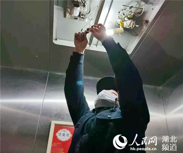 武漢地鐵集團(tuán)下沉黨員幫助社區(qū)維修電梯燈光(屈炎 攝)