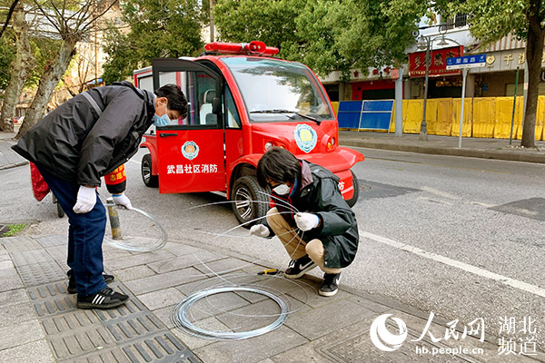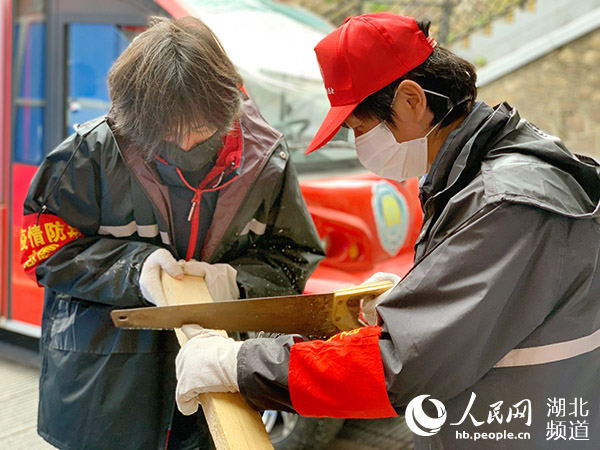 實(shí)施封閉管理,阻斷病毒傳播途徑是打贏防疫阻擊戰(zhàn)最直接、最迅速、最有效的手段。當(dāng)前,老舊小區(qū)封閉管理主要采用的是封閉板堵出口、值守人員守路口、巡查人員嚴(yán)巡防等方式。但由于雨雪大風(fēng)、人為破壞等原因,封堵板時(shí)有破損。來(lái)自武昌區(qū)建設(shè)局的呂大治和陳家清,是定點(diǎn)至民主路社區(qū)的兩位下沉干部,他們主動(dòng)承擔(dān)起社區(qū)巡查值守、安裝及維修封堵板的工作,成立起“封板維修突擊隊(duì)。“藍(lán)色的是封板,用于較長(zhǎng)路段的圍擋;黃色的是水馬,內(nèi)部可以注水,因此基座更穩(wěn),用在小路口以及圍擋破損處;還有木板、鋸尺、鐵絲等,也是日常必備的工具,用于較小破損口的維補(bǔ)!眳未笾就疽贿呌描F絲和老虎鉗固定著水馬,一邊介紹道。