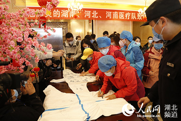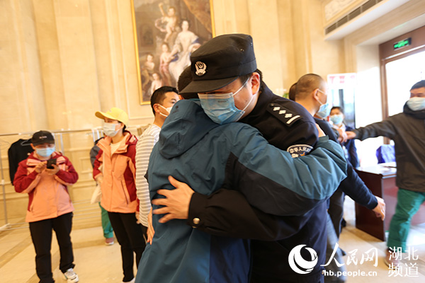 人民網(wǎng)武漢3月18日電 (周雯)17日下午,湖南省第六批援漢醫(yī)療隊完成使命從黃陂出發(fā),啟程回湘。臨別時,武漢市黃陂區(qū)公安分局漢口北民警鄭希準(zhǔn)備了一件防護服讓湖南隊醫(yī)護幫忙簽字留作紀(jì)念,在簽字時看見熟悉的名字“高勸”,才發(fā)現(xiàn)面前的醫(yī)生就是方艙里一起奮戰(zhàn)的戰(zhàn)友,兩人激動地握手、抱在一起,互換了微信,相約“江湖”再見。