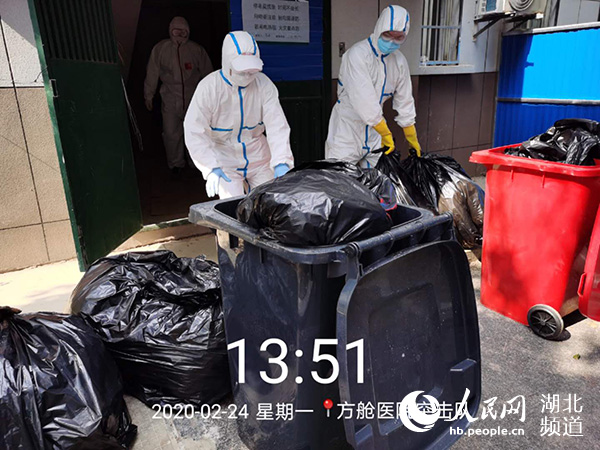 醫(yī)療點(diǎn)每天會(huì)清理出80大包患者的生活垃圾,最多時(shí)達(dá)3噸。由于沒有電梯,只能一袋袋背到樓下。