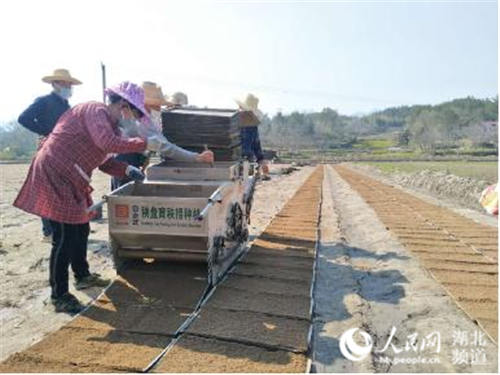 圖為新隆農(nóng)機(jī)合作社正在進(jìn)行機(jī)械育秧