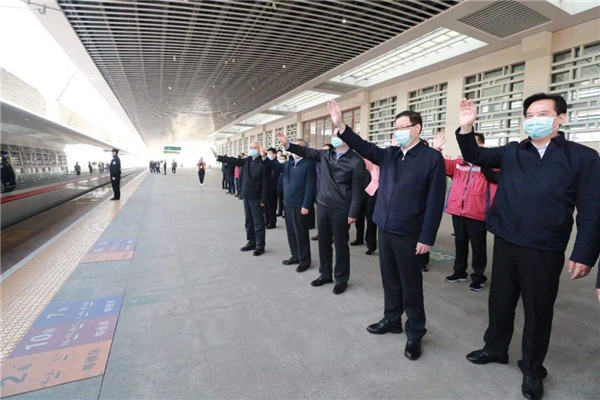 圖為湖北省委書記應(yīng)勇站臺送行務(wù)工人員。