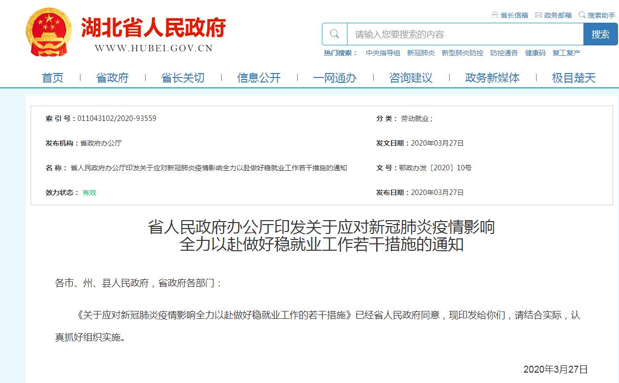 人民網(wǎng)武漢3月28日電 3月27日,湖北省政府辦公廳印發(fā)《關(guān)于應(yīng)對(duì)新冠肺炎疫情影響全力以赴做好穩(wěn)就業(yè)工作的若干措施》,圍繞全力推動(dòng)安全有序復(fù)工返崗、支持企業(yè)減負(fù)穩(wěn)崗、促進(jìn)多渠道就業(yè)、促進(jìn)高校畢業(yè)生就業(yè)、推進(jìn)創(chuàng)業(yè)帶就業(yè)、實(shí)施就業(yè)扶貧、做好困難人員兜底保障、做實(shí)職業(yè)培訓(xùn)和就業(yè)服務(wù)、加強(qiáng)組織保障等9個(gè)方面,共計(jì)25條具體措施。