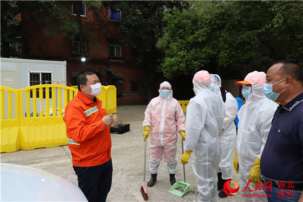 蘇志斌給清運(yùn)方艙醫(yī)院醫(yī)廢垃圾的員工講解安全防護(hù)。(陶媛 攝)