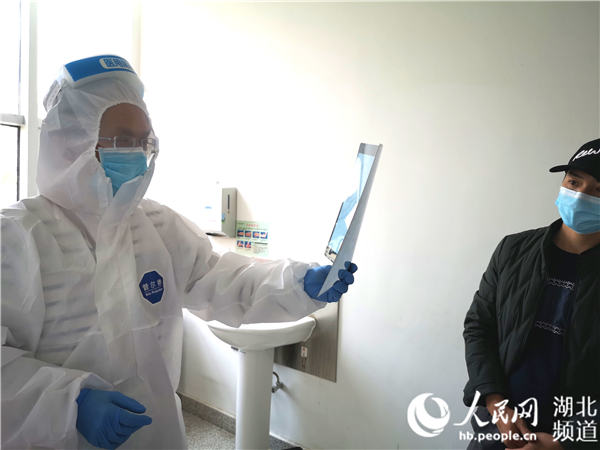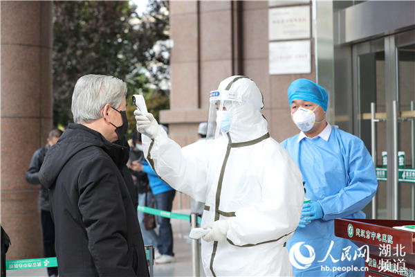 醫(yī)院門診大廳入口處工作人員為患者檢測(cè)體溫。(武漢市中心醫(yī)院供圖)