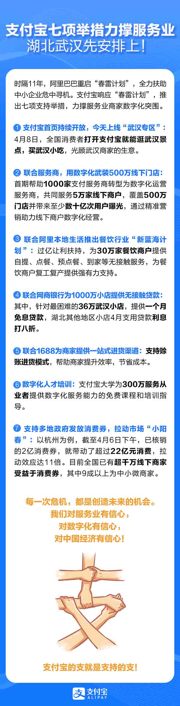 這七項(xiàng)舉措集中在推動線下門店數(shù)字化升級、提供低成本金融支持、拉動服務(wù)性消費(fèi)等方面,將率先在湖北武漢落地。4月8日,武漢“解封”首日,支付寶首頁第一時(shí)間上線武漢專題頁,讓全國消費(fèi)者打開手機(jī)就能“逛”武漢景點(diǎn)、買武漢小吃,光顧武漢商家的生意,換種方式為武漢加油。上線僅一小時(shí),就有2600萬網(wǎng)友連夜“云逛街”。