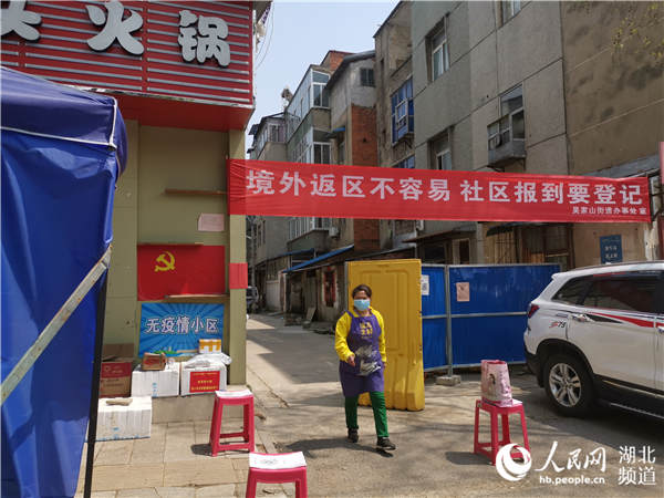 武漢市東西湖區(qū)一社區(qū)門口堅(jiān)持防疫不松懈。(周雯 攝)